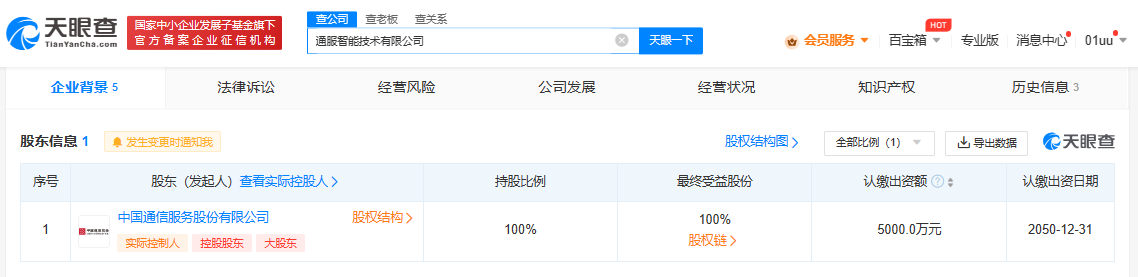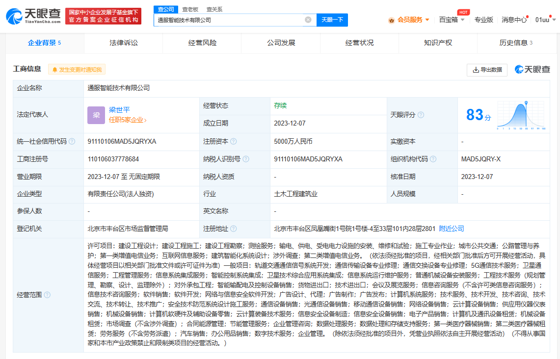南方财经12月11日电,天眼查App显示,近日,通服智能技术有限公司成立,法定代表人为梁世平,注册资本5000万人民币,经营范围包括轨道交通通信信号系统开发、通信传输设备专业修理、通信交换设备专业修理、5G通信技术服务、卫星通信服务、信息系统运行维护服务等。股东信息显示,该公司由中国通信服务(HK.00552)全资持股。
