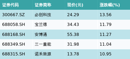 截至收盘,北京主题涨跌幅最高的五只股票为:必创科技(300667.SZ)、宝兰德(688058.SH)、安博通(688168.SH)、三一重能(688349.SH)与诺禾致源(688315.SH)。详情见下表: