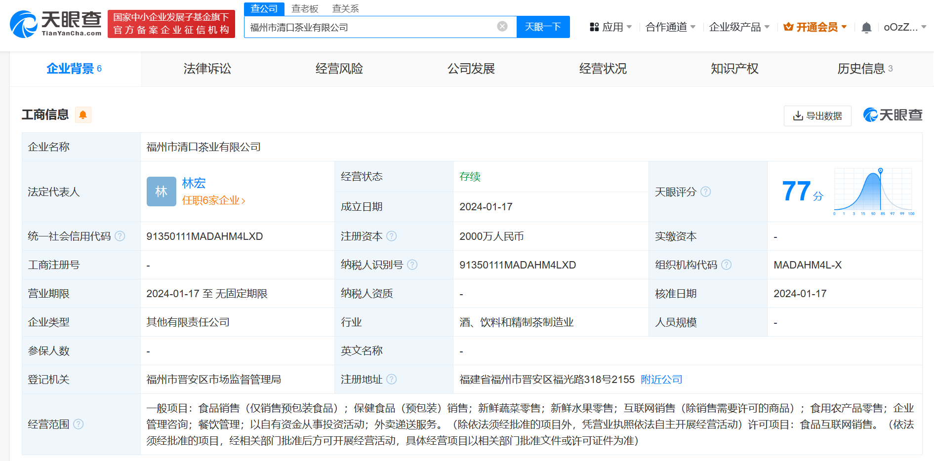 南方财经1月22日电,天眼查App显示,近日,福州市清口茶业有限公司成立,法定代表人为林宏,注册资本2000万人民币,经营范围含食品销售、互联网销售、食用农产品零售、餐饮管理、以自有资金从事投资活动、外卖递送服务等。股权全景穿透图显示,该公司由茶百道旗下四川蜀信同源企业管理咨询有限公司、福州市青口二茶茶叶有限公司分别持股67%、33%。据报道,1月9日,晋安区新店镇人民政府与茶百道集团、福州市青口二茶茶叶有限公司签订合作协议,茶百道高端茶叶生产基地项目正式落地新店镇金城民营工业区。