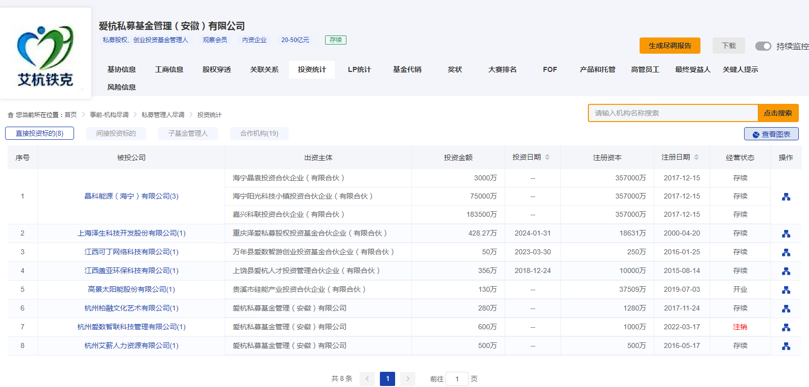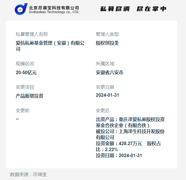 南方财经1月31日电,据尽调宝数据显示,1月31日爱杭私募基金管理(安徽)有限公司发生投资变更,其旗下重庆泽爱私募股权投资基金合伙企业(有限合伙)产品新增投资上海泽生科技开发股份有限公司,认缴金额为428.27万元股权占比2.22%。该公司直接投资10家标的、间接投资0家标的。中基协登记信息显示,爱杭私募基金管理(安徽)有限公司是一家私募股权、创业投资基金管理人,成立于2015年07月21日,注册资本1.00亿元,其中实缴资本3875.00万元,管理规模产品区间为20-50亿元,实际控制人为何亮。
