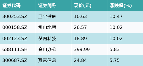 截至午间收盘,华为HMS主题涨跌幅最高的五只股票为:卫宁健康(300253.SZ)、常山北明(000158.SZ)、梦网科技(002123.SZ)、金山办公(688111.SH)与赛意信息(300687.SZ)。详情见下表: