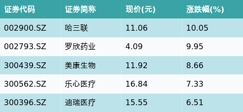 截至早盘收盘,医疗器械主题涨跌幅最高的五只股票为:哈三联(002900.SZ)、罗欣药业(002793.SZ)、美康生物(300439.SZ)、乐心医疗(300562.SZ)与迪瑞医疗(300396.SZ)。详情见下表: