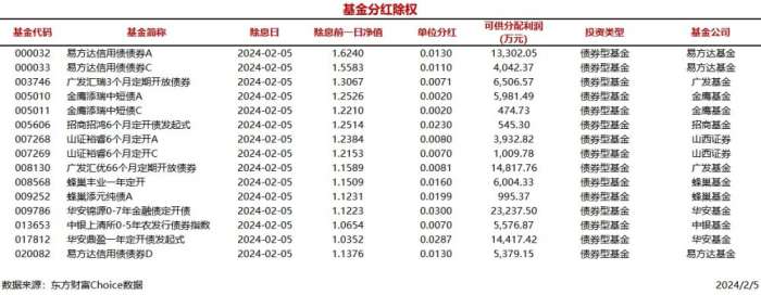 南方财经2月5日电,据东方财富Choice数据统计,今日共有15只基金分红除权(A/C类分开计算),均为债券型基金,累计可供分配利润10.62亿元。