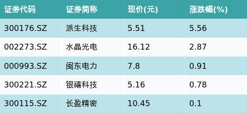 截至收盘,宁德时代概念主题涨跌幅最高的五只股票为:派生科技(300176.SZ)、水晶光电(002273.SZ)、闽东电力(000993.SZ)、银禧科技(300221.SZ)与长盈精密(300115.SZ)。详情见下表:
