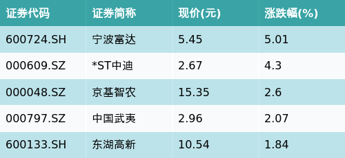 截至收盘,房地产开发主题涨跌幅最高的五只股票为:宁波富达(600724.SH)、*ST中迪(000609.SZ)、京基智农(000048.SZ)、中国武夷(000797.SZ)与东湖高新(600133.SH)。详情见下表: