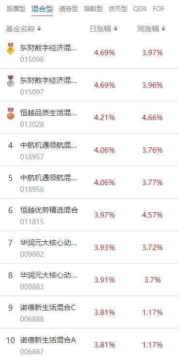 南方财经3月18日电,根据南财基金通数据:2024年3月15日当日收益较高的混合型基金包括:西藏东财数字经济优选混合型发起式证券投资基金(015097,日收益4.69%);恒越品质生活混合型发起式证券投资基金(013028,日收益4.21%);中航机遇领航混合型发起式证券投资基金(018957,日收益4.06%)等。收益较低的混合型基金包诺:招商行业领先混合型证券投资基金(217012,日收益-1.52%);华泰柏瑞港股通时代机遇混合型证券投资基金(011355,日收益-1.49%);万家宏观择时多策略灵活配置混合型证券投资基金(519212,日收益-1.47%)等。
