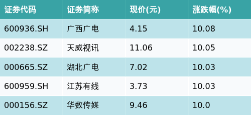 截至早盘收盘,电视广播主题涨跌幅最高的五只股票为:广西广电(600936.SH)、天威视讯(002238.SZ)、湖北广电(000665.SZ)、江苏有线(600959.SH)与华数传媒(000156.SZ)。详情见下表: