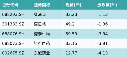 截至收盘,CRO/CMO主题涨跌幅最高的五只股票为:奥浦迈(688293.SH)、诺思格(301333.SZ)、诺泰生物(688076.SH)、毕得医药(688073.SH)与东诚药业(002675.SZ)。详情见下表: