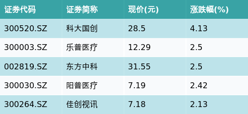 截至收盘,脑机接口主题涨跌幅最高的五只股票为:科大国创(300520.SZ)、乐普医疗(300003.SZ)、东方中科(002819.SZ)、阳普医疗(300030.SZ)与佳创视讯(300264.SZ)。详情见下表: