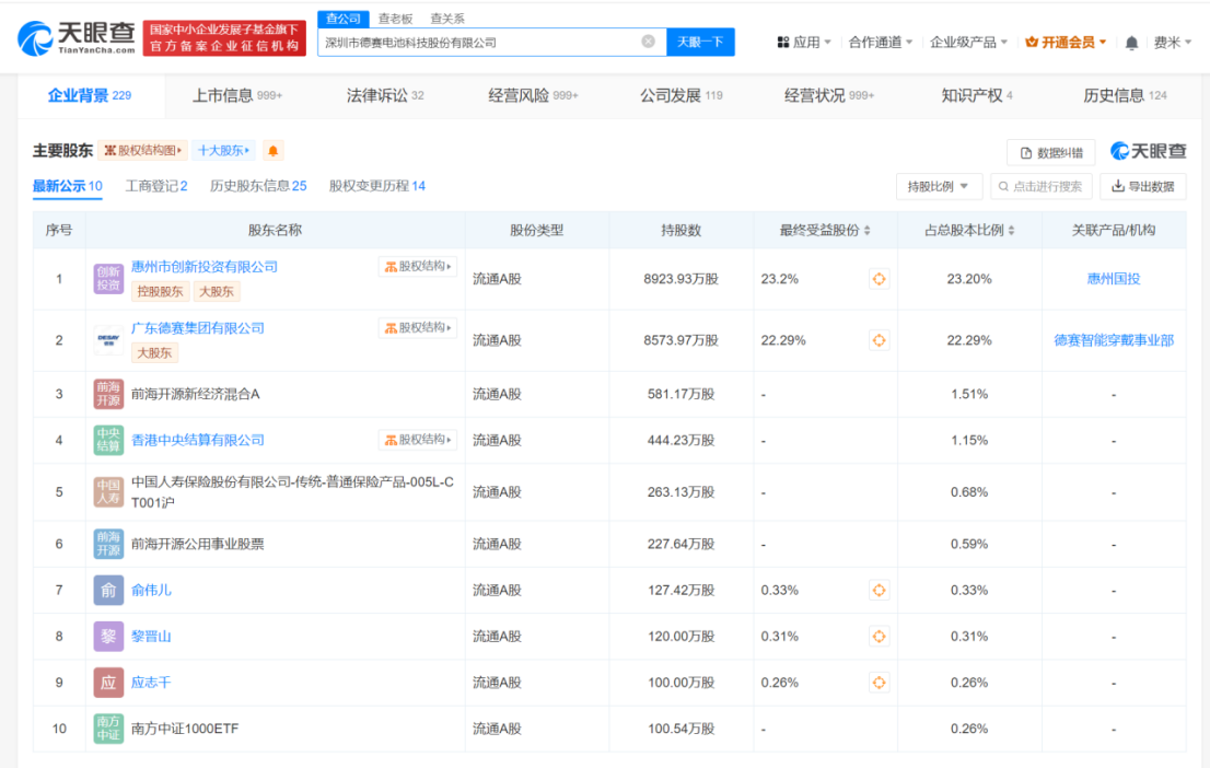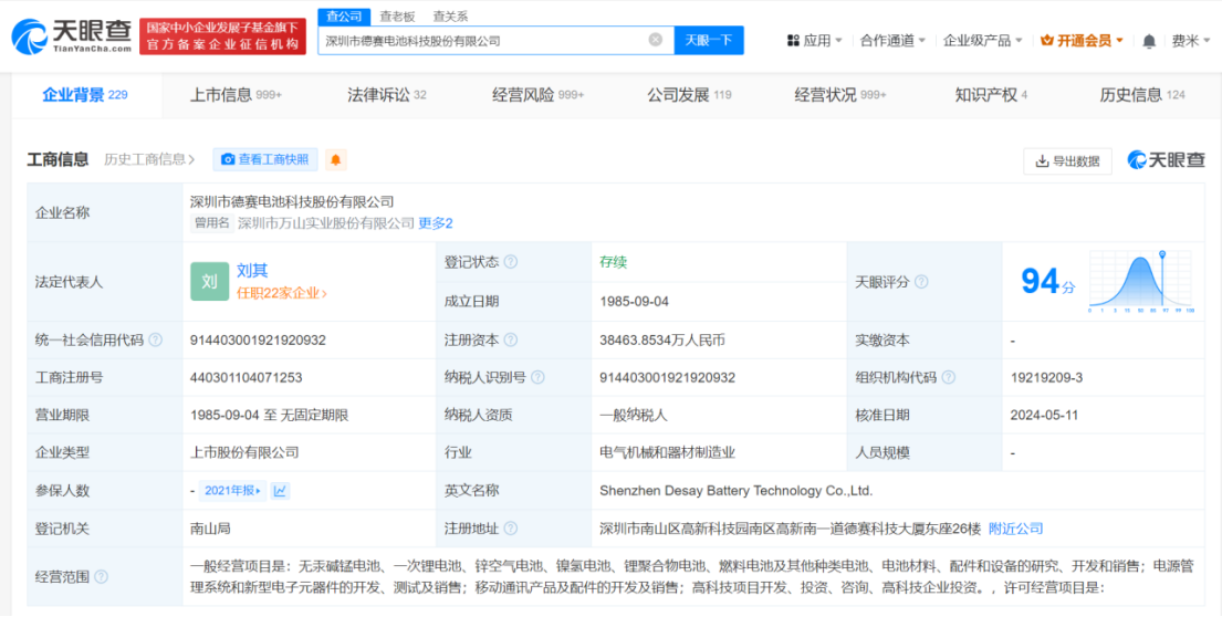 南方财经5月15日电,天眼查App显示,近日,德赛电池(000049)发生工商变更,注册资本由约2.99亿人民币增至约3.85亿人民币,同时多位董事和监事发生变更。深圳市德赛电池科技股份有限公司成立于1985年9月,法定代表人、董事长为刘其,经营范围含电池、电池材料、配件和设备的研究、开发和销售,电源管理系统和新型电子元器件的开发、测试及销售等,由惠州市创新投资有限公司、广东德赛集团有限公司、香港中央结算有限公司等共同持股。