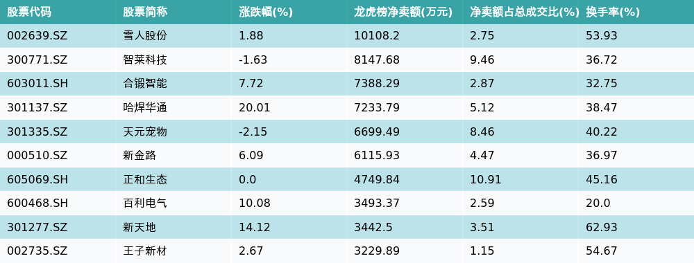 南财智讯5月27日电,南财金融终端数据显示,因当日异动登上龙虎榜的个股中,龙虎榜中资金净流出最多的前三位分别是雪人股份(002639.SZ)、智莱科技(300771.SZ)与合锻智能(603011.SH)。其中排名第一的雪人股份被净卖出1.01亿元,占总成交金额的2.75%。雪人股份收盘上涨1.88%,换手率为53.93%。净卖出额前10个股详情见下图: