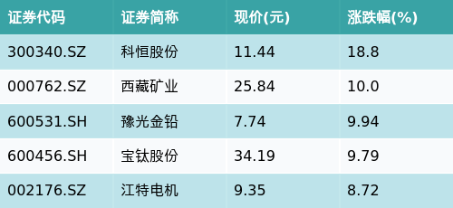 截至收盘,稀缺资源主题涨跌幅最高的五只股票为:科恒股份(300340.SZ)、西藏矿业(000762.SZ)、豫光金铅(600531.SH)、宝钛股份(600456.SH)与江特电机(002176.SZ)。详情见下表:
