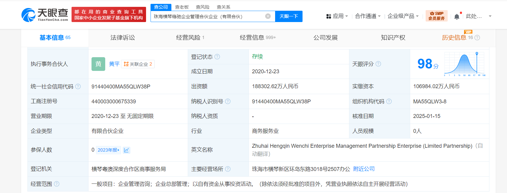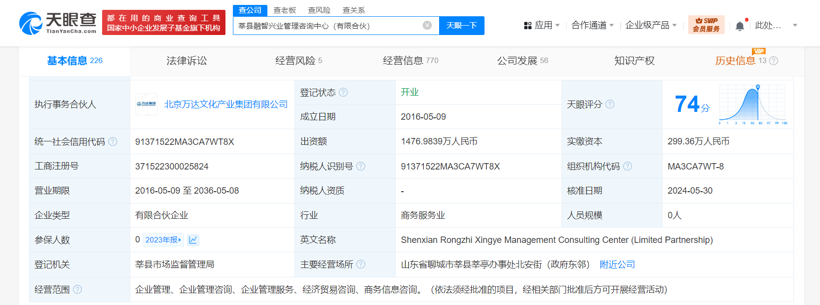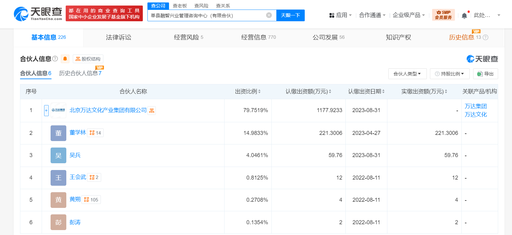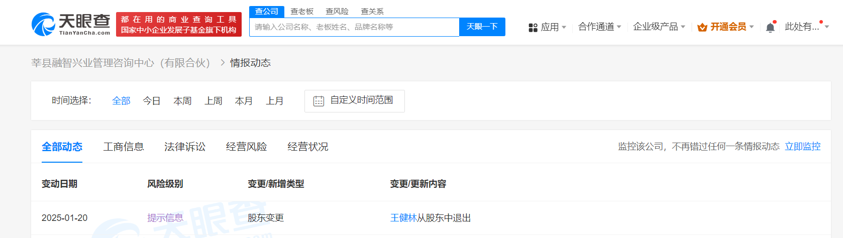 南方财经1月20日电,天眼查App显示,近日,珠海横琴稳驰企业管理合伙企业(有限合伙)、莘县融智兴业管理咨询中心(有限合伙)发生工商变更,王健林退出上述两企业合伙人行列。珠海横琴稳驰企业管理合伙企业(有限合伙)成立于2020年12月,执行事务合伙人为黄平,出资额约18.8亿人民币,经营范围为企业管理咨询、企业总部管理,由崔宗明、宁奇峰、大连万达集团股份有限公司等共同出资。莘县融智兴业管理咨询中心(有限合伙)成立于2016年5月,执行事务合伙人为北京万达文化产业集团有限公司,出资额约1477万人民币,经营范围为企业管理、企业管理咨询、企业管理服务、经济贸易咨询、商务信息咨询,现由北京万达文化产业集团有限公司、董学林、吴兵等6位合伙人共同出资。值得一提的是,近期,万达旗下大连万达稳泰管理咨询合伙企业(有限合伙)也发生工商变更,王健林退出合伙人行列,退出前出资比例约78.6%。