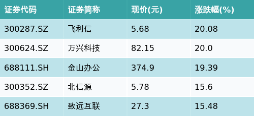 截至午间收盘,远程办公主题涨跌幅最高的五只股票为:飞利信(300287.SZ)、万兴科技(300624.SZ)、金山办公(688111.SH)、北信源(300352.SZ)与致远互联(688369.SH)。详情见下表: