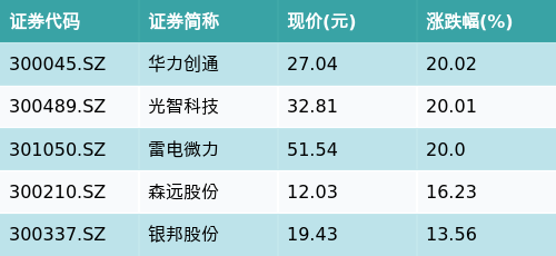 截至午间收盘,军工主题涨跌幅最高的五只股票为:华力创通(300045.SZ)、光智科技(300489.SZ)、雷电微力(301050.SZ)、森远股份(300210.SZ)与银邦股份(300337.SZ)。详情见下表: