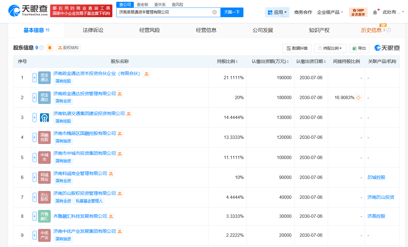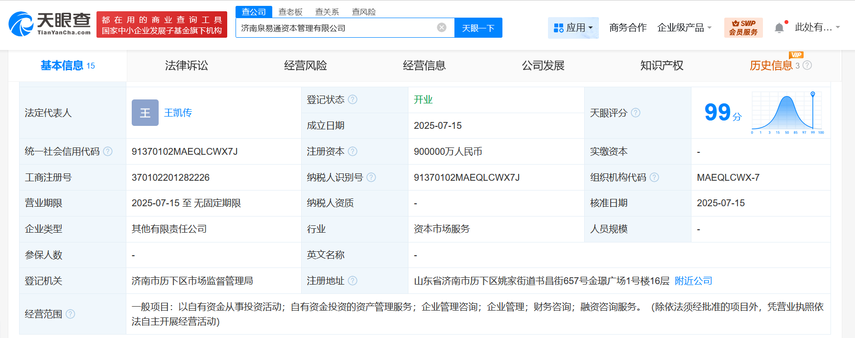 南方财经7月18日电,天眼查App显示,近日,济南泉易通资本管理有限公司成立,法定代表人为王凯传,注册资本90亿人民币,经营范围为以自有资金从事投资活动、自有资金投资的资产管理服务、企业管理咨询、企业管理、财务咨询、融资咨询服务。股东信息显示,该公司由济南政金通达资本投资合伙企业(有限合伙)、济南政金通达投资管理有限公司、济南轨道交通集团建设投资有限公司、济南市槐荫区国融控股有限公司等共同持股。