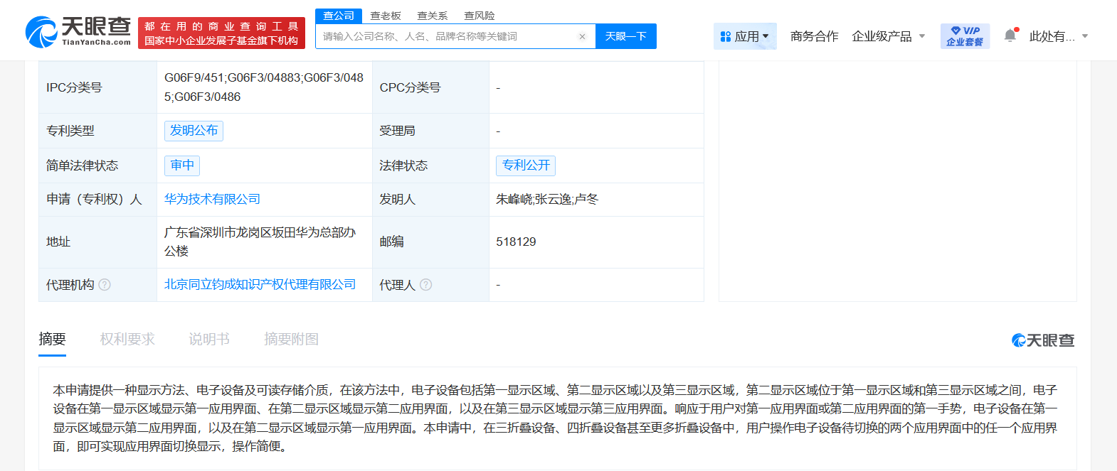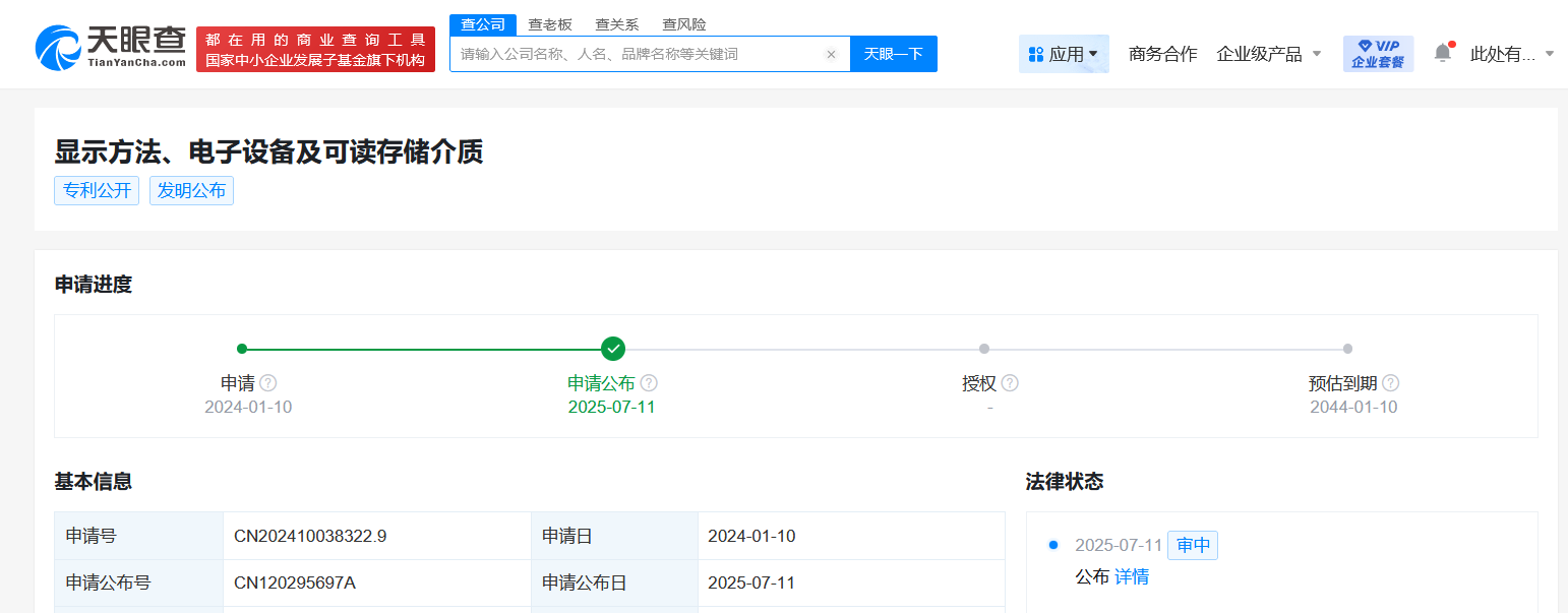 南方财经7月11日电,天眼查财产线索信息显示,近日,华为技术有限公司申请的“显示方法、电子设备及可读存储介质”专利公布。摘要显示,在该方法中,电子设备包括第一显示区域、第二显示区域以及第三显示区域,第二显示区域位于第一显示区域和第三显示区域之间。响应于用户对第一应用界面或第二应用界面的第一手势,电子设备在第一显示区域显示第二应用界面,以及在第二显示区域显示第一应用界面。本申请中,在三折叠设备、四折叠设备甚至更多折叠设备中,用户操作电子设备待切换的两个应用界面中的任一个应用界面,即可实现应用界面切换显示,操作简便。