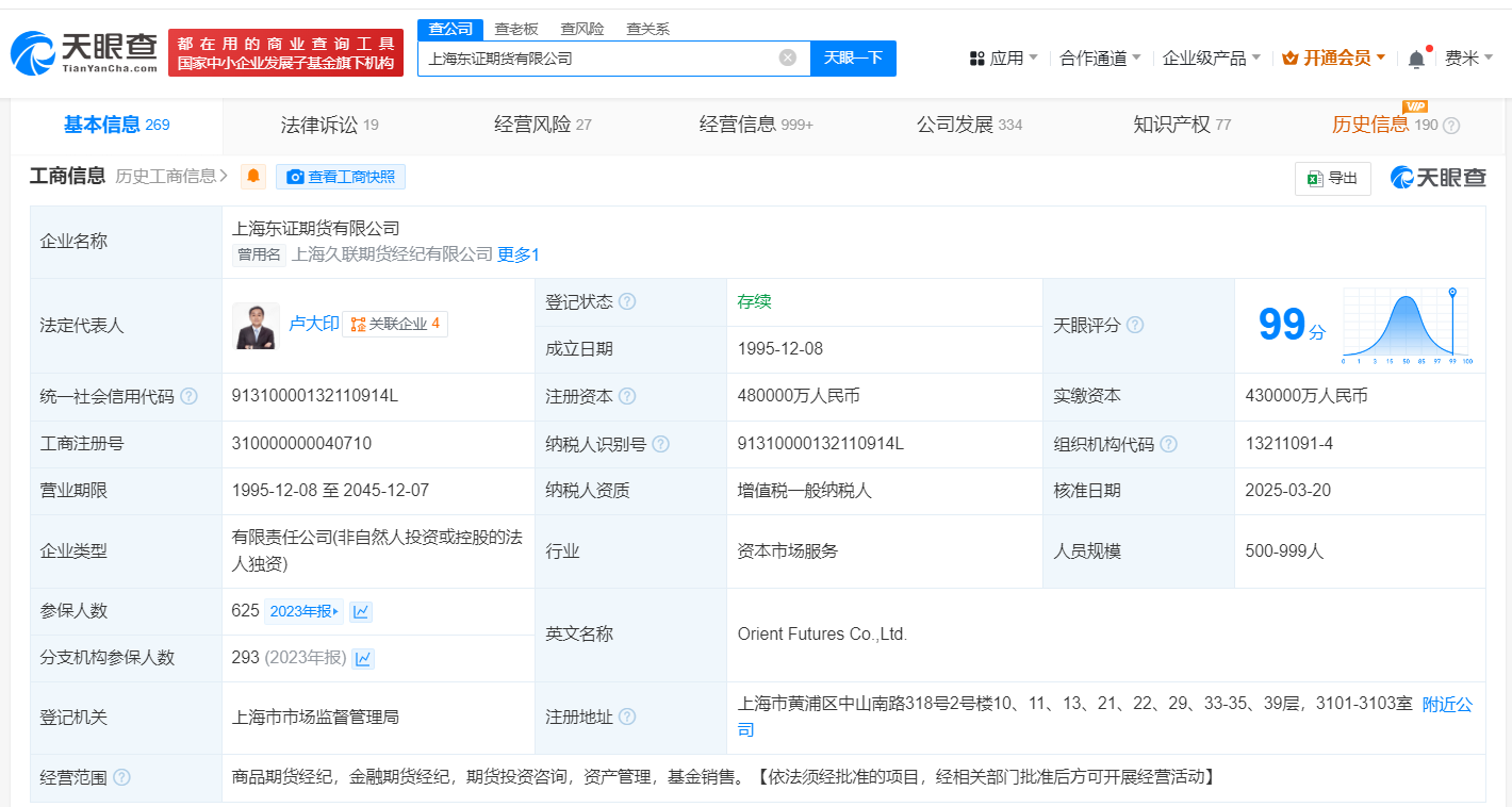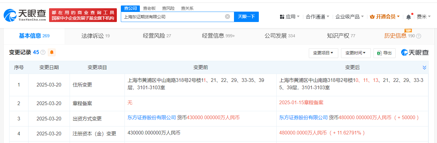 南方财经3月26日电,天眼查App显示,近日,上海东证期货有限公司发生工商变更,注册资本由43亿人民币增至48亿人民币,增幅约12%。该公司成立于1995年12月,法定代表人为卢大印,经营范围为商品期货经纪、金融期货经纪、期货投资咨询、资产管理、基金销售,由东方证券(600958)全资持股。
