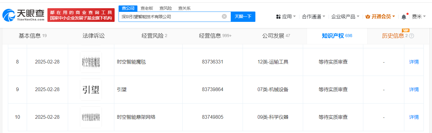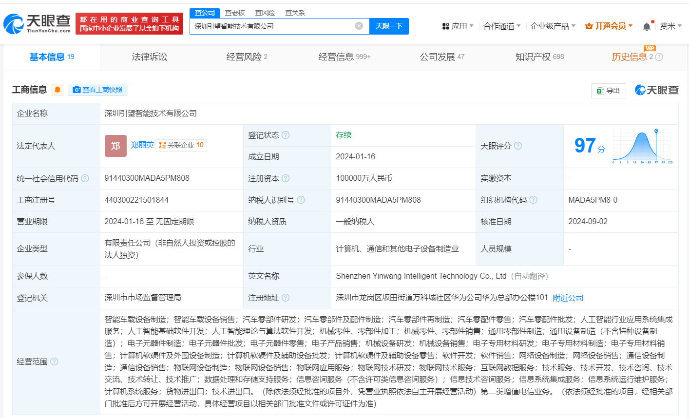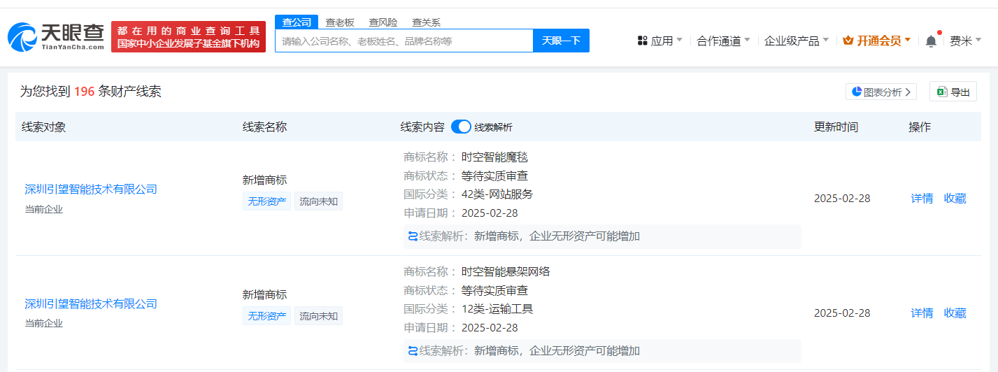 南方财经3月18日电,天眼查财产线索信息显示,近日,深圳引望智能技术有限公司申请注册多枚“时空智能悬架网络”“时空智能魔毯”商标,国际分类包括运输工具、网站服务、科学仪器等,当前商标状态均为等待实质审查。深圳引望智能技术有限公司成立于2024年1月,法定代表人为郑丽英,注册资本10亿人民币,经营范围包括智能车载设备制造、智能车载设备销售、汽车零部件研发等,由华为技术有限公司全资持股。