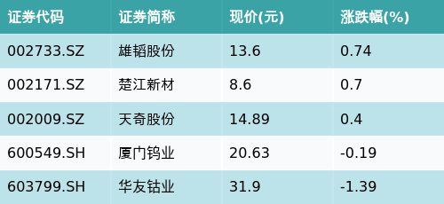 截至收盘,动力电池回收主题涨跌幅最高的五只股票为:雄韬股份(002733.SZ)、楚江新材(002171.SZ)、天奇股份(002009.SZ)、厦门钨业(600549.SH)与华友钴业(603799.SH)。详情见下表: