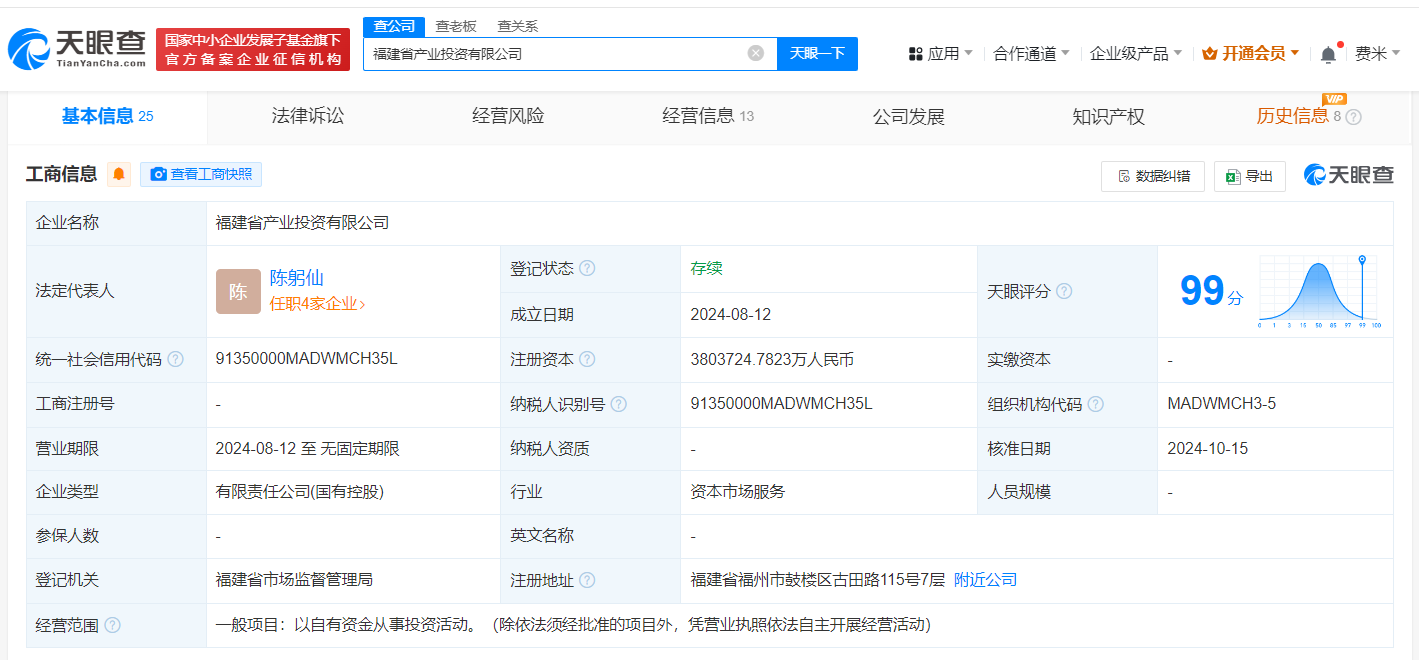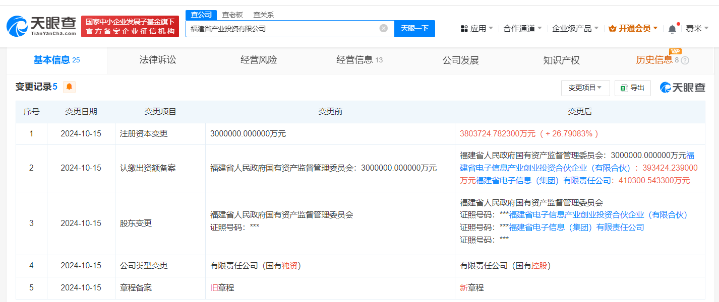 南方财经10月18日电,天眼查App显示,近日,福建省产业投资有限公司发生工商变更,新增福建省电子信息(集团)有限责任公司、福建省电子信息产业创业投资合伙企业(有限合伙)为股东,同时注册资本由300亿人民币增至约380.4亿人民币。福建省产业投资有限公司成立于今年8月,法定代表人为陈躬仙,经营范围为以自有资金从事投资活动,现由福建省人民政府国有资产监督管理委员会及上述新增股东共同持股。