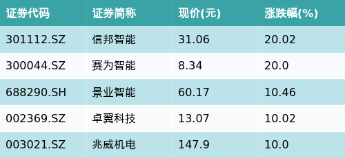 截至早盘收盘,机器人概念主题涨跌幅最高的五只股票为:信邦智能(301112.SZ)、赛为智能(300044.SZ)、景业智能(688290.SH)、卓翼科技(002369.SZ)与兆威机电(003021.SZ)。详情见下表: