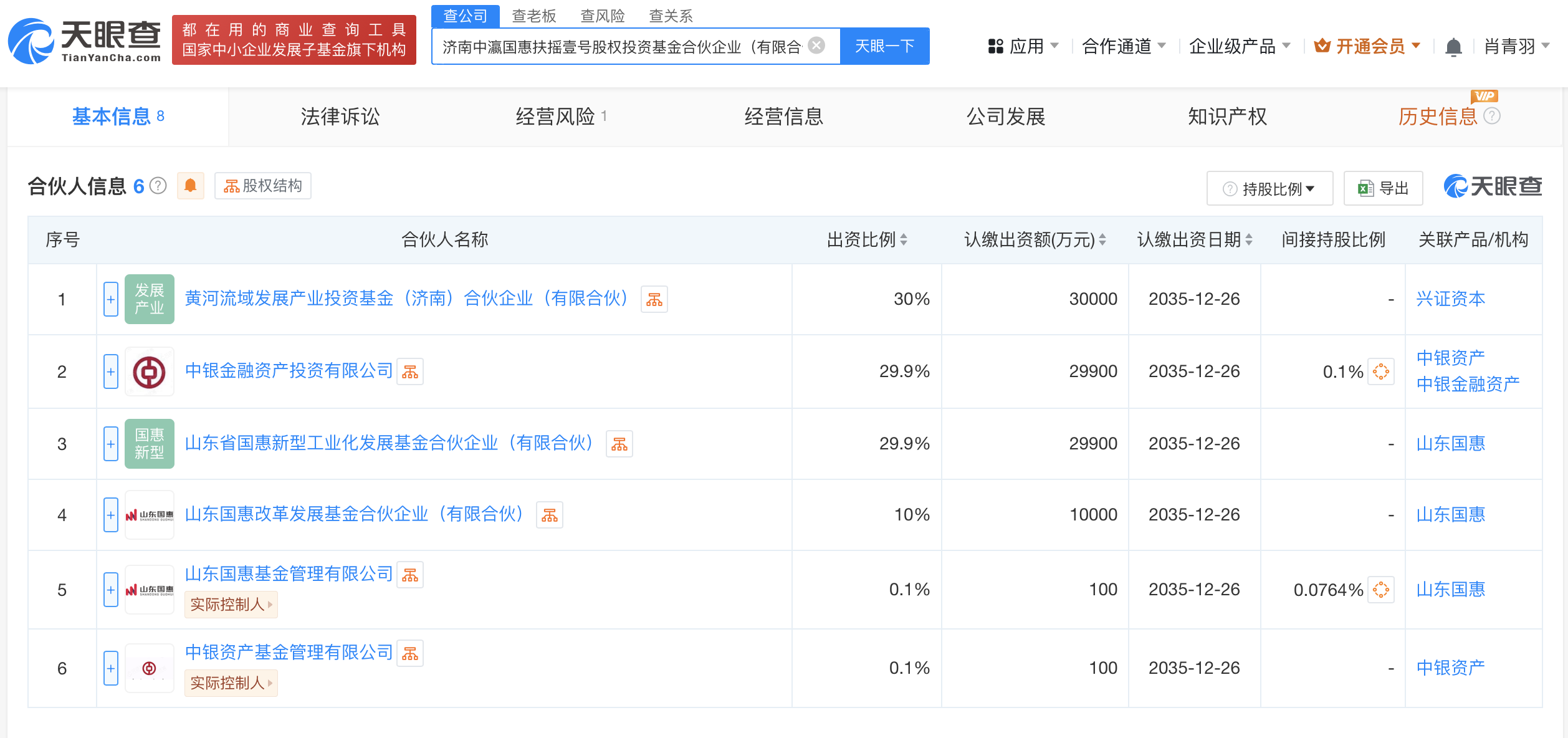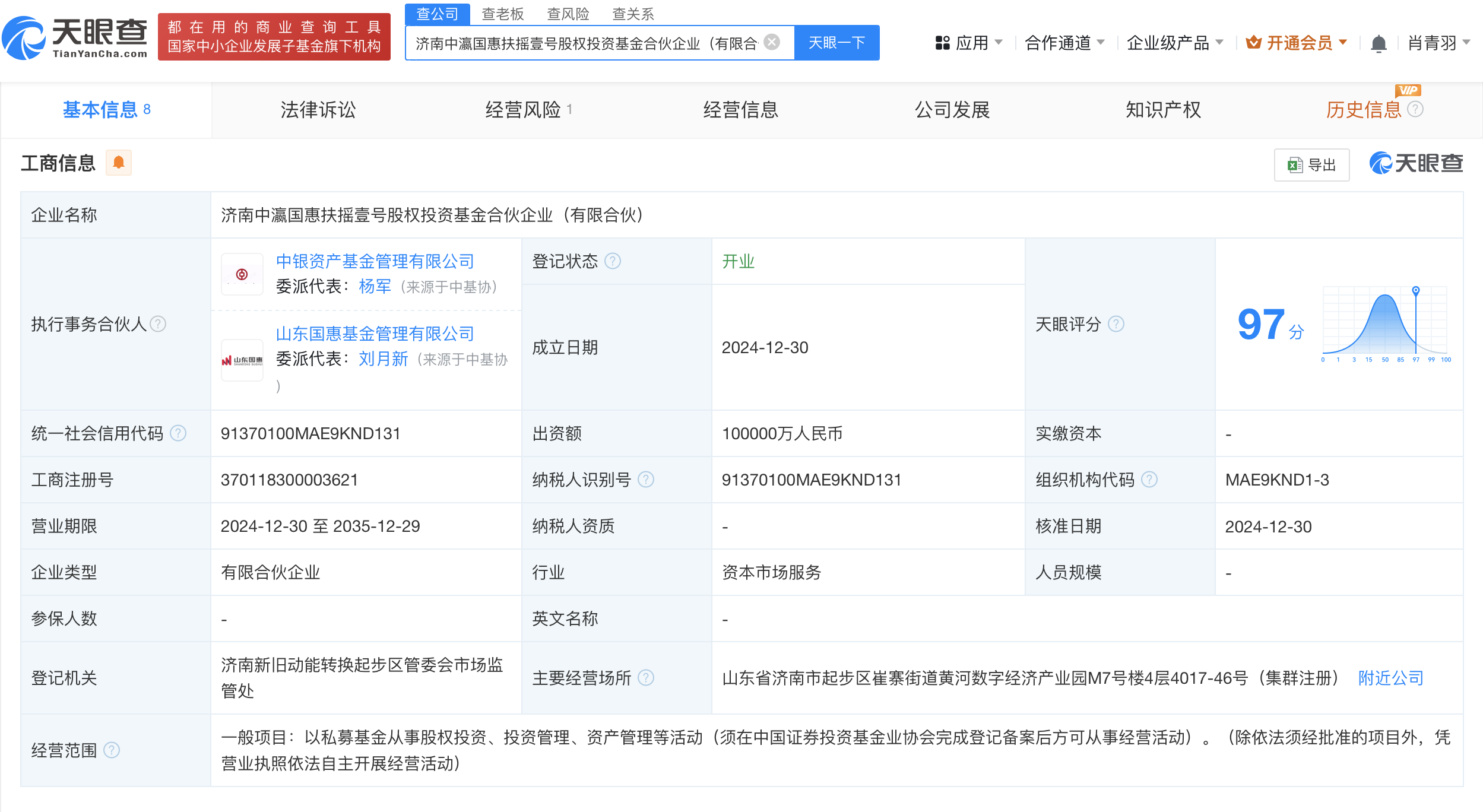 南方财经12月31日电,天眼查App显示,近日,济南中瀛国惠扶摇壹号股权投资基金合伙企业(有限合伙)成立,执行事务合伙人为中银资产基金管理有限公司、山东国惠基金管理有限公司,出资额10亿人民币,经营范围为以私募基金从事股权投资、投资管理、资产管理等活动。合伙人信息显示,该企业由黄河流域发展产业投资基金(济南)合伙企业(有限合伙)、中银金融资产投资有限公司、山东省国惠新型工业化发展基金合伙企业(有限合伙)等共同出资。据媒体报道,近日,中国银行山东省分行与中国银行旗下中银金融资产投资有限公司推动“济南中瀛国惠扶摇壹号股权投资基金”在济南新旧动能转换起步区注册成立。该基金是山东省首支、黄河流域首支金融资产投资公司(AIC)股权投资基金,将聚焦济南四大主导产业,通过股权投资为数字经济、科技创新赋能,为实体经济高质量发展注入新动力。