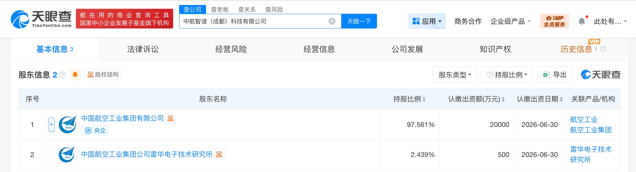 南方财经4月22日电,天眼查App显示,近日,中航智谱(成都)科技有限公司成立,法定代表人为程宇峰,注册资本2.05亿人民币,经营范围含雷达及配套设备制造、通信设备制造、通信设备销售、电子元器件制造、电子元器件批发、电子元器件零售、非居住房地产租赁等。股东信息显示,该公司由中国航空工业集团有限公司、中国航空工业集团公司雷华电子技术研究所共同持股。