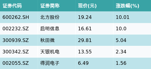 截至收盘,无人驾驶主题涨跌幅最高的五只股票为:北方股份(600262.SH)、启明信息(002232.SZ)、秋田微(300939.SZ)、天银机电(300342.SZ)与得润电子(002055.SZ)。详情见下表: