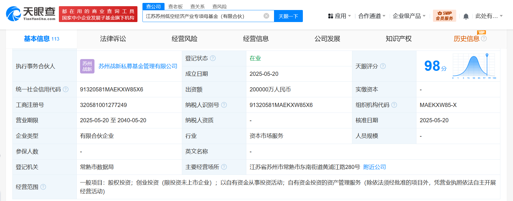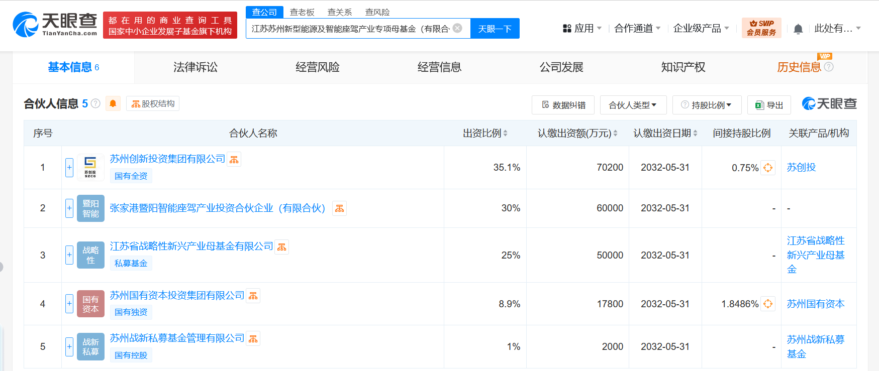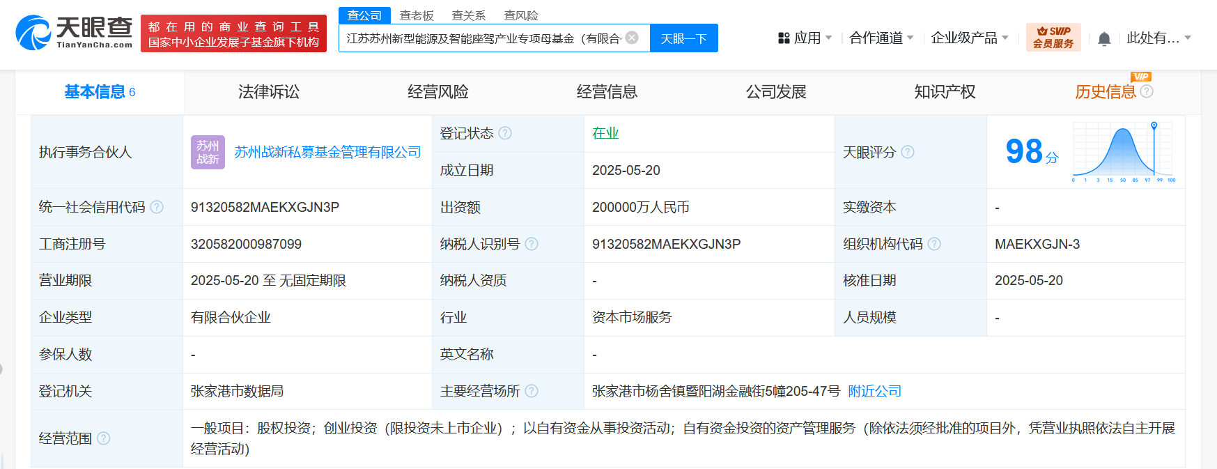 南方财经5月22日电,天眼查App显示,近日,江苏苏州新型能源及智能座驾产业专项母基金(有限合伙)成立,执行事务合伙人为苏州战新私募基金管理有限公司,出资额20亿人民币,经营范围为股权投资、创业投资、以自有资金从事投资活动、自有资金投资的资产管理服务。合伙人信息显示,该基金由苏州创新投资集团有限公司、张家港暨阳智能座驾产业投资合伙企业(有限合伙)、江苏省战略性新兴产业母基金有限公司、苏州国有资本投资集团有限公司、苏州战新私募基金管理有限公司共同出资。值得一提的是,江苏苏州低空经济产业专项母基金(有限合伙)也于同日成立,出资额20亿人民币。据媒体报道,近日,江苏省、苏州市正式审议通过第二批苏州市战略性新兴产业基金组建方案,第二批4只总规模105亿元苏州市战新基金正式进入落地阶段。投资范围涵盖人工智能、低空经济等新赛道。