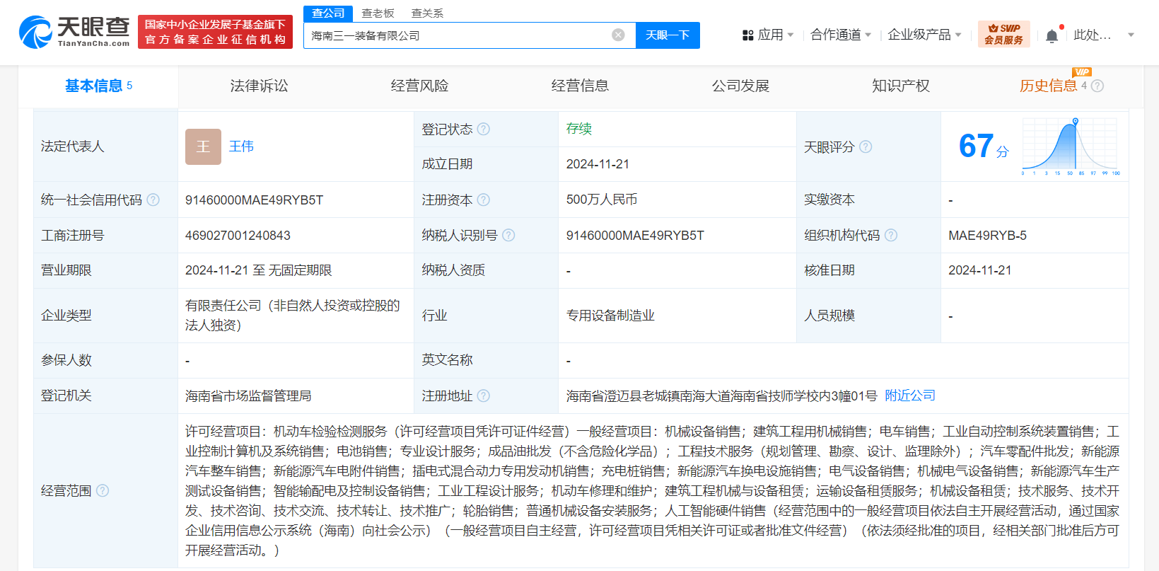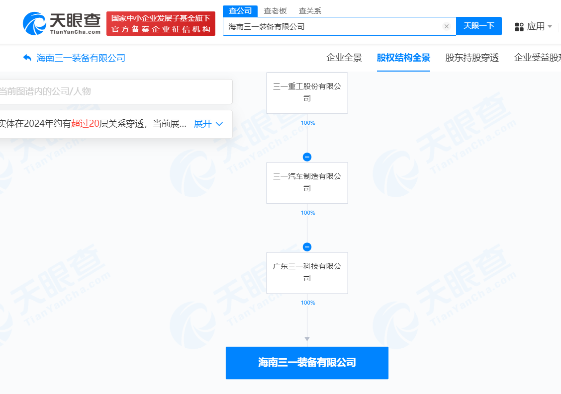 南方财经11月26日电,天眼查App显示,近日,海南三一装备有限公司成立,法定代表人为王伟,注册资本500万人民币,经营范围含机动车检验检测服务、机械设备销售、建筑工程用机械销售、电车销售、工业自动控制系统装置销售、新能源汽车整车销售、充电桩销售、智能输配电及控制设备销售、人工智能硬件销售等。股权全景穿透图显示,该公司由广东三一科技有限公司全资持股,后者由三一重工(600031)间接全资持股。