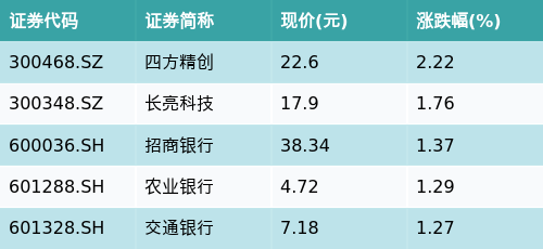 截至午间收盘,跨境支付(CIPS)主题涨跌幅最高的五只股票为:四方精创(300468.SZ)、长亮科技(300348.SZ)、招商银行(600036.SH)、农业银行(601288.SH)与交通银行(601328.SH)。详情见下表: