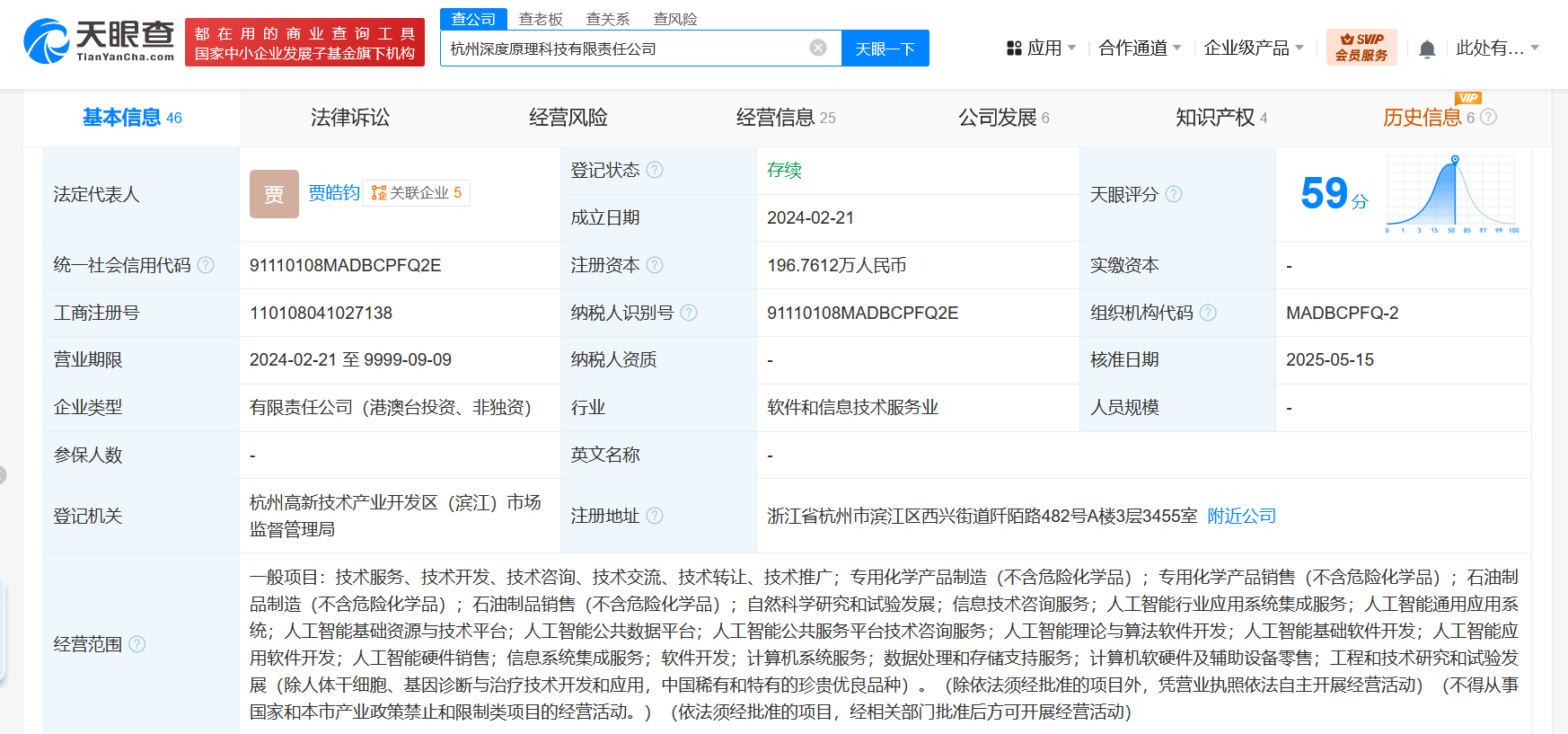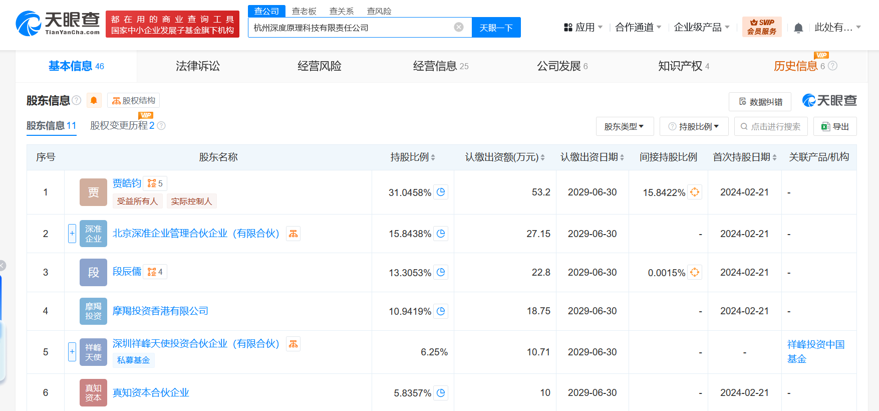 南方财经5月19日电,天眼查App显示,近日,杭州深度原理科技有限责任公司发生工商变更,新增百度旗下三亚百川致新私募股权投资基金合伙企业(有限合伙)以及上海思源探索创业投资合伙企业(有限合伙)、广州联想创业投资基金合伙企业(有限合伙)、晶泰控股有限公司、联想之星阿尔法基金(有限合伙)为股东,同时,该公司注册资本由171.36万人民币增至约196.76万人民币。杭州深度原理科技有限责任公司成立于2024年2月,法定代表人为贾皓钧,经营范围含专用化学产品制造、石油制品销售、自然科学研究和试验发展、信息技术咨询服务、人工智能行业应用系统集成服务、人工智能通用应用系统、人工智能公共数据平台等。股东信息显示,该公司现由贾皓钧、北京深准企业管理合伙企业(有限合伙)、段辰儒、摩羯投资香港有限公司及上述新增股东等共同持股。公开信息显示,深度原理是一家全球领先的AIforMaterials科技创新公司,致力于通过人工智能技术加速材料化学创新。
