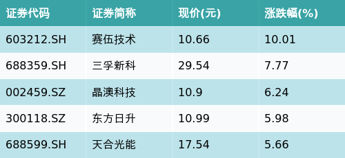 截至午间收盘,HJT电池主题涨跌幅最高的五只股票为:赛伍技术(603212.SH)、三孚新科(688359.SH)、晶澳科技(002459.SZ)、东方日升(300118.SZ)与天合光能(688599.SH)。详情见下表: