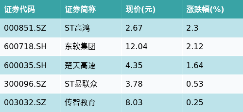 截至收盘,国产操作系统主题涨跌幅最高的五只股票为:ST高鸿(000851.SZ)、东软集团(600718.SH)、楚天高速(600035.SH)、ST易联众(300096.SZ)与传智教育(003032.SZ)。详情见下表: