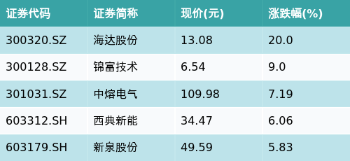 截至午间收盘,特斯拉概念主题涨跌幅最高的五只股票为:海达股份(300320.SZ)、锦富技术(300128.SZ)、中熔电气(301031.SZ)、西典新能(603312.SH)与新泉股份(603179.SH)。详情见下表: