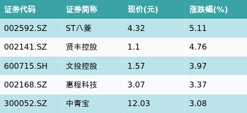 截至午间收盘,网络游戏主题涨跌幅最高的五只股票为:ST八菱(002592.SZ)、贤丰控股(002141.SZ)、文投控股(600715.SH)、惠程科技(002168.SZ)与中青宝(300052.SZ)。详情见下表: