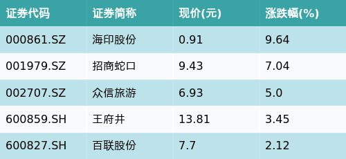 截至午间收盘,免税店概念主题涨跌幅最高的五只股票为:海印股份(000861.SZ)、招商蛇口(001979.SZ)、众信旅游(002707.SZ)、王府井(600859.SH)与百联股份(600827.SH)。详情见下表:
