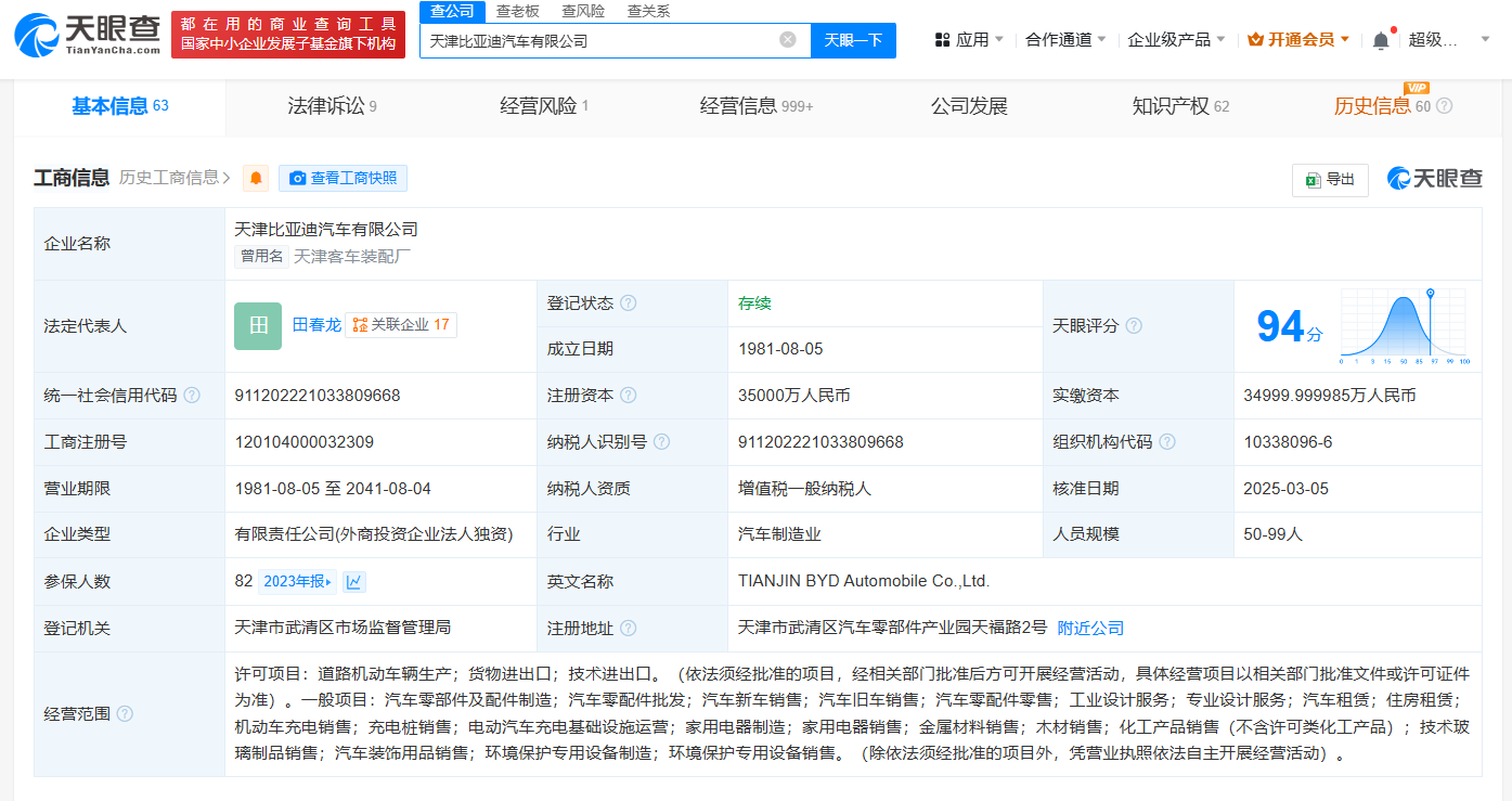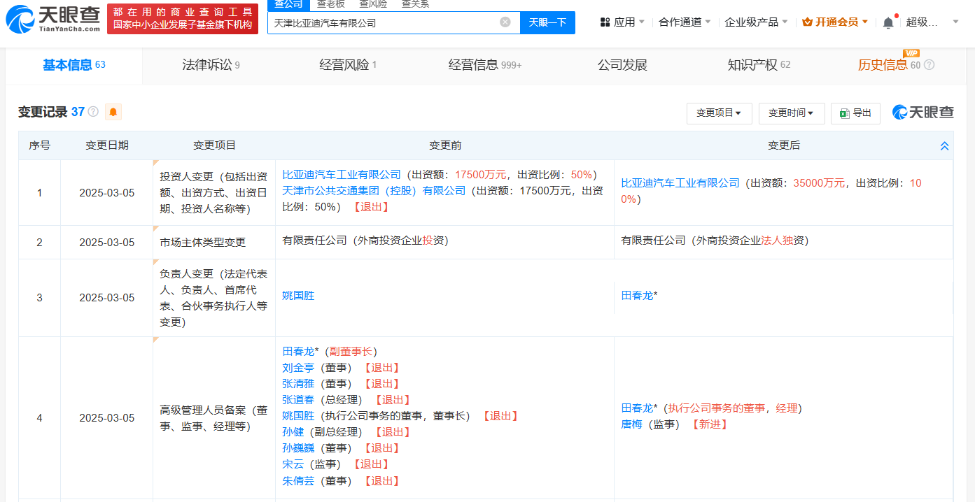 南方财经3月7日电,天眼查App显示,近日,天津比亚迪汽车有限公司发生工商变更,天津市公共交通集团(控股)有限公司退出股东行列,同时该公司法定代表人等主要人员均发生变更。该公司成立于1981年8月,注册资本3.5亿人民币,经营范围包括道路机动车辆生产、汽车零部件及配件制造、汽车零配件批发、汽车新车销售等,现由比亚迪汽车工业有限公司全资持股。公开信息显示,2023年8月,天津市公共交通集团(控股)有限公司挂牌转让天津比亚迪汽车有限公司50%股权。