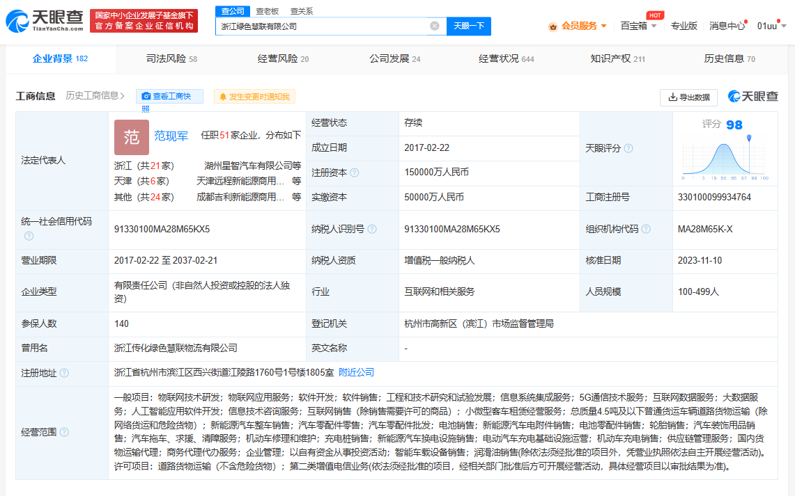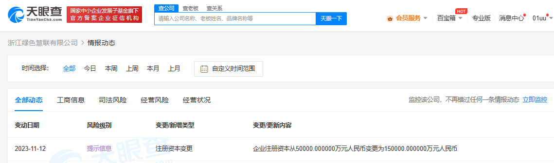 南方财经11月13日电,天眼查App显示,近日,浙江绿色慧联有限公司发生工商变更,注册资本由5亿人民币增至15亿人民币。该公司成立于2017年2月,法定代表人为范现军,经营范围包括信息系统集成服务、5G通信技术服务、互联网数据服务、大数据服务、人工智能应用软件开发等,由吉利旗下远程商用车科技有限公司全资持股。