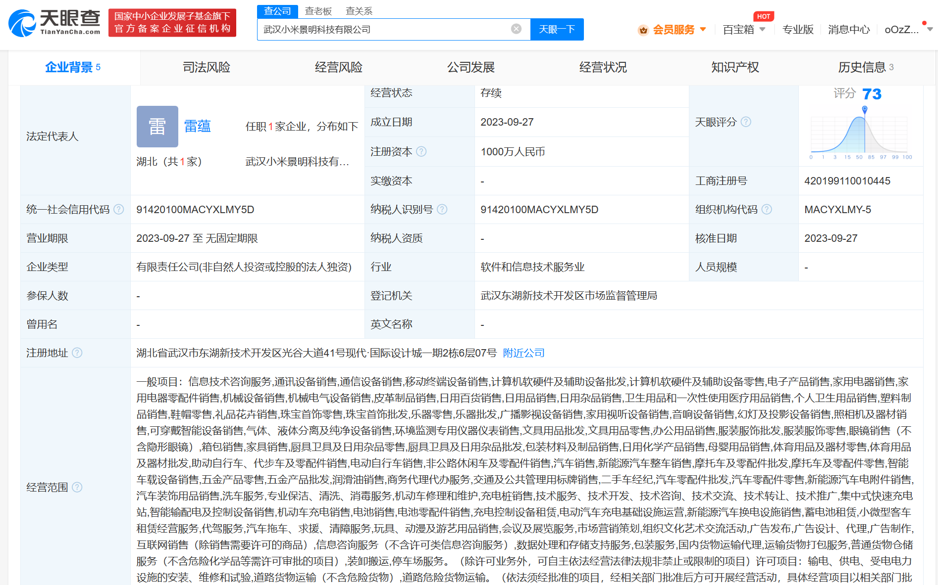 小米在武汉深圳成立景明科技公司 含汽车销售服务