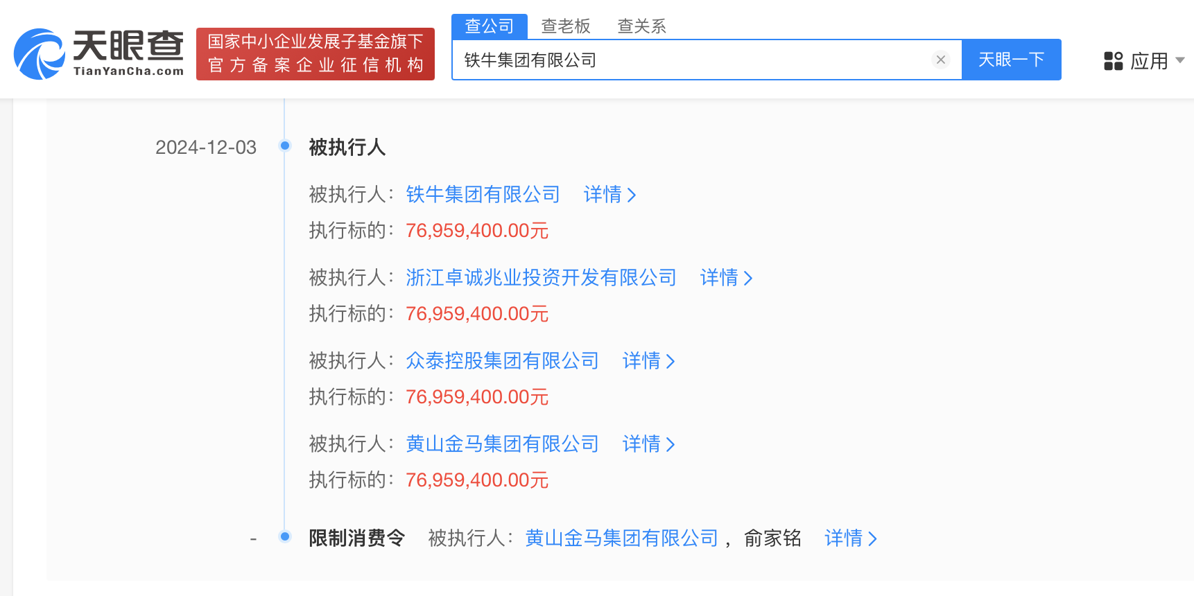 南方财经12月4日电,天眼查法律诉讼信息显示,12月3日,铁牛集团有限公司、浙江卓诚兆业投资开发有限公司、众泰控股集团有限公司、黄山金马集团有限公司新增1条恢复执行信息,执行标的7695万余元,执行法院为安徽省黄山市中级人民法院。天眼风险信息显示,铁牛集团有限公司现存3条被执行人信息,被执行总金额超8亿元。此外,该公司还存在多条限制消费令和股权冻结信息。