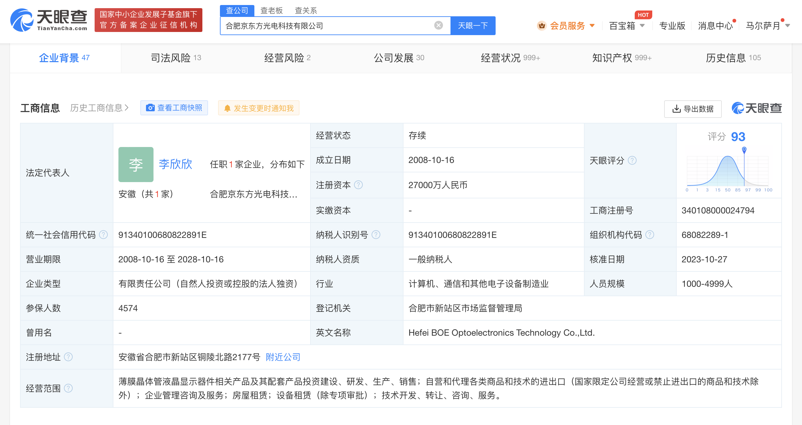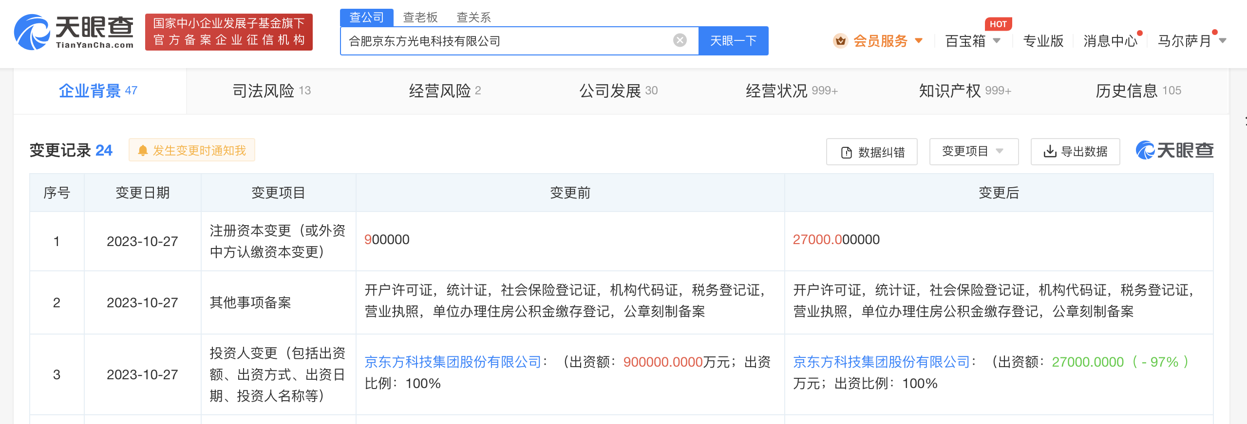 南方财经10月30日电,天眼查App显示,近日,合肥京东方光电科技有限公司发生工商变更,注册资本由90亿人民币减至2.7亿人民币,减幅97%。该公司成立于2008年10月,法定代表人为李欣欣,经营范围包括薄膜晶体管液晶显示器件相关产品及其配套产品投资建设、研发、生产、销售等,由京东方A(000725)全资持股。