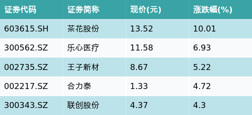 截至收盘,可降解塑料主题涨跌幅最高的五只股票为:茶花股份(603615.SH)、乐心医疗(300562.SZ)、王子新材(002735.SZ)、合力泰(002217.SZ)与联创股份(300343.SZ)。详情见下表: