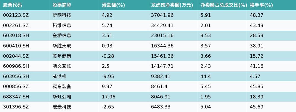 南方财经2月19日电,南财金融终端数据显示,因当日异动登上龙虎榜的个股中,龙虎榜中资金净流出最多的前三位分别是梦网科技(002123.SZ)、拓维信息(002261.SZ)与金桥信息(603918.SH)。其中排名第一的梦网科技被净卖出3.7亿元,占总成交金额的5.91%。梦网科技收盘上涨4.92%,换手率为48.37%。净卖出额前10个股详情见下图: