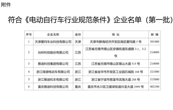 工信部公布第一批符合《电动自行车行业规范条件》企业名单 6家企业上榜