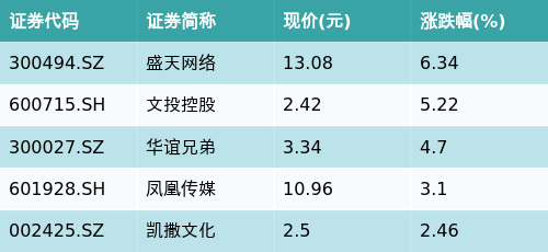 截至收盘,手游概念主题涨跌幅最高的五只股票为:盛天网络(300494.SZ)、文投控股(600715.SH)、华谊兄弟(300027.SZ)、凤凰传媒(601928.SH)与凯撒文化(002425.SZ)。详情见下表: