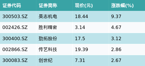 截至收盘,3D玻璃主题涨跌幅最高的五只股票为:昊志机电(300503.SZ)、胜利精密(002426.SZ)、劲拓股份(300400.SZ)、传艺科技(002866.SZ)与创世纪(300083.SZ)。详情见下表: