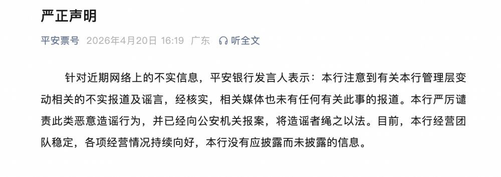 平安银行辟谣:管理层变动系谣言,已报案