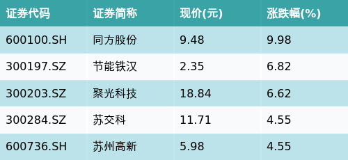 截至午间收盘,海绵城市主题涨跌幅最高的五只股票为:同方股份(600100.SH)、节能铁汉(300197.SZ)、聚光科技(300203.SZ)、苏交科(300284.SZ)与苏州高新(600736.SH)。详情见下表:
